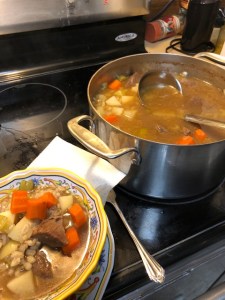 I made lunch by reheating the quiche from yesterday. It was still delicious. I ordered barley and stew beef for homemade beef barley soup. I cooked the meat, next time I will make it smaller, and the barley. I added carrots, celery, onion (cooked with the beef to create a lighter flavor for onions), beef broth, and potatoes. It is a bit bland but still hit-the-spot. I figure soup, homemade, is what you make in a smoke and fire emergency. The news stations are all reporting that people should stay at home and not go outside. That sounds like time for soup!