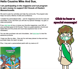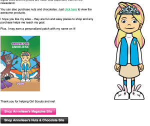 Susie’s cousin’s kids are girl scouts now in Boston and we received an email for the chance to support them today. I bought some products to be shipped. They have cartoon images on the email of themselves in 2020.