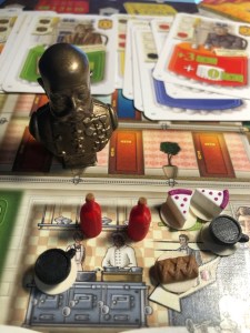 I close the Nike computer and turn to the website Board Game Geek for lunch on my personal Apple computer. I like to do a full-stop from work and look at gaming videos and updates as a way to recharge. While eating my sandwich and soup, I learned that one of my favorite games, The Grand Hotel Austria, has a Kickstarter for an add-on starting in a few weeks. It is called Let’s Waltz and will likely add some more options to the game and to reprint the base game (it is hard to get a copy). I have upgraded my copy of The Grand Hotel Austria by 3D printing a bust of Emperor Franz Joseph as a marker for government support in the game and buying 3D printed wine, coffee, strudel, and cake markers. In this game, you have to supply guests with goods before placing them in their rooms. I love moving little strudel and coffee cups!