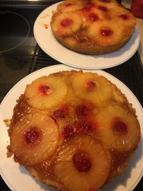 I did make Pineapple Upside-down Cake today. Just yellow cake mix poured over brown sugar, pineapple rings with cherries in their center, and lots of butter bits. I remember when I was a little kid watching my father and grandfather making it in a microwave when they were new at the Laingsburg Homeshow. Mom would also do the same routine, I remember. It was one of the few cakes one could make in a microwave. It was one of the selling pitches of Wild’s Furniture and Appliances, “You can even make dessert.” Back in those days, the whole family would do microwave pitches at the Home Show!
