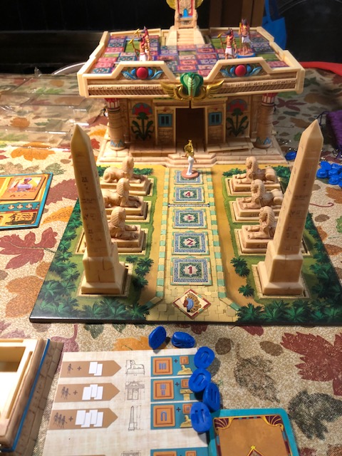 I then practiced a game of a new board game, Cleopatra and the Society of Architects. I played two players to get an understanding of the rules. You assemble Cleopatra’s palace-temple while playing the game.