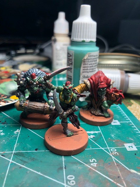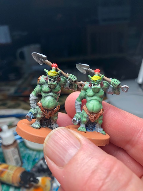 I finished the orcs painting today for the board game Heroes of Air, Land, and Sea. The oil paint for the shading is drying now overnight. I use the oil paint as it dries without a color change and can be whipped off or even removed with thinner without impact the color underneath (I applied a non-glossy transparent spray to protect the initial painting).