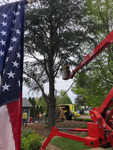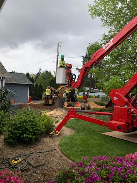 After it broke, after being trimmed with care, and dropped a huge branch on my neighbor’s house, it had to go. The weather here is damp and windy. Non-native trees fall and break. So today, they brought in some incredible equipment and disassembled the tree like it was a kit and ground it and its stump to a pile of wood chips.