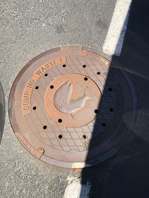 Yesterday I took this photo of a manhole cover. In Oregon, they have the image of a fish on them to remind you not to pour crap into our sewers and rainwater systems.