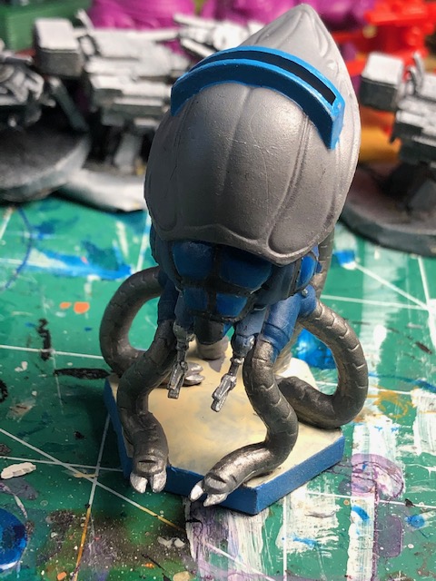I returned home and went back to painting this afternoon, hoping to finish more of Richard’s miniatures for Anachrony this holiday. I am painting the blue faction that looks like a cross of a giant squid and a mole crab. I am painting it mostly shades of blue and metal with a gray base shade. I tried to put a decal on the figure, but the surfaces are too curved to do this easily.