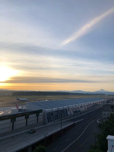 I stopped by PDX after dropping off Mariah. I parked the car on the 7th floor of the car park. It was just minutes after sunrise, and Mount Hood was clearly visible.