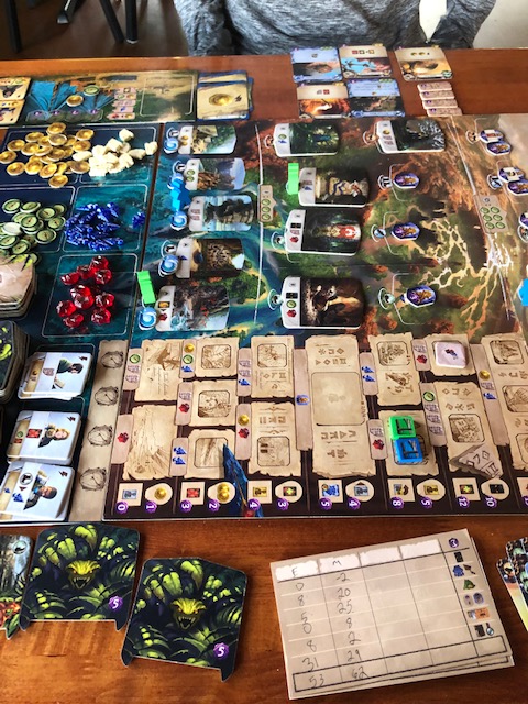 This is often called a mid-weight worker placement and Euro game. It also includes a deck-building mechanic with deck thinning, which I think adds to the game’s charm for me. We played on the advance board this time, and we also had some misplays. For example, we did not get the iconography in some cards that only apply to campsites, not the more valuable explored sites. We corrected that and a few other mistakes.