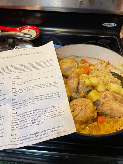 During the last meeting, a large 300+ Zoom meeting, I started dinner. Again, I tried the Japanese-style one-pot curry chicken with rice. It needs more salt, but other than that, it came out well. Chicken thighs are cooked in the pot in oil until slightly brown (not fully cooked). Garlic, ginger, nutmeg, green curry powder, and onion are cooked and mixed with washed plain rice. Add a few potatoes peeled and diced with sliced carrots. Add a lot of broth. Bake for 375F for about an hour. Not bad for a raining cold Oregon fall day.