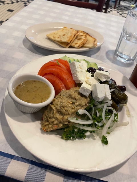 It was almost three in the afternoon; I had taken off for Greek food down the street by then. I had a salad and an iced tea. I followed that up with dessert and coffee.