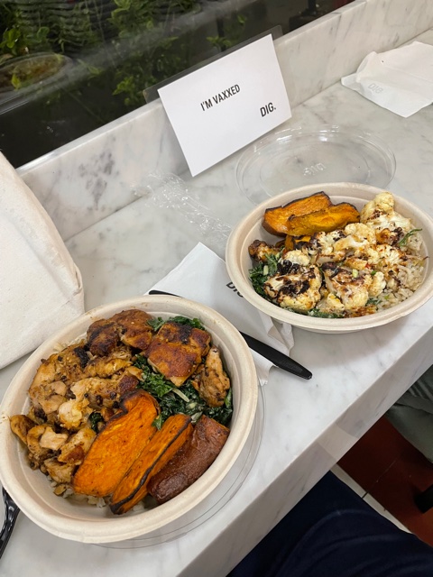 Dinner was at DIG nearby. It was raining by then, and Kat and I, being from Oregon, just sort of ignored the rain. The food there is a bowl, and you pick the items. I told them to just make me something they liked. It was good with Kat having only roasted veggies. It was tasty.
