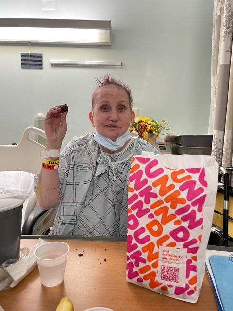 Susie was not in her room as she was in PT. So I got a chair from Anne Oakley, the nurse for the area, and waited. Finally, Susie was walking with a walker down the hallway. I presented her with the donut holes (I decided on those as they are easier to eat).