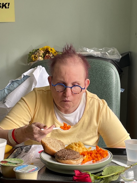 Susie was not dressed but had finished breakfast. So we are back to Anne O as Susie’s nurse over the weekend. We all agreed that Susie should get dressed in regular clothing. So Susie spent the day dressed.