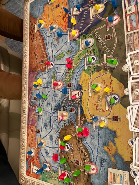I then taught, and we played a game of Concordia. This is a fav and Kat had played with me when she was in Oregon a few months ago with her parents. So Kat had a handle on the game. This is a resource and worker placement game using a deck-building mechanism to allow the player more options. Each turn, a card is played, and the action(s) on the card is done. For example, the placement of trading houses over the Roman times and managing resources for that would be a good game, but adding card purchasing and super-powers in the cards makes it an excellent game. The scoring is based on how many Roman providences you trade-in, how many non-brick trading posts you have, and how many different types of items you trade. This is multiplied by the kinds of cards you have at the end of the game.