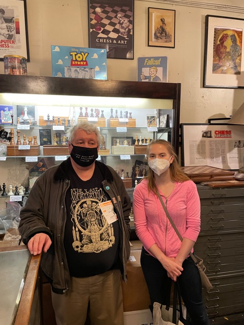 A few blocks, and we find a shop that has seen better days, Chess Forum. The paint is peeling, there is moss on the sign, the wood here and there turning to dry rot, but the store is packed. All the tables outside are engaged in chess. The narrow, dusty, and almost Harry Potter-like shop is stuffed full of people, and there are more chess tables in the back with more games in play. Chess sets are everywhere for sale, and some are old.