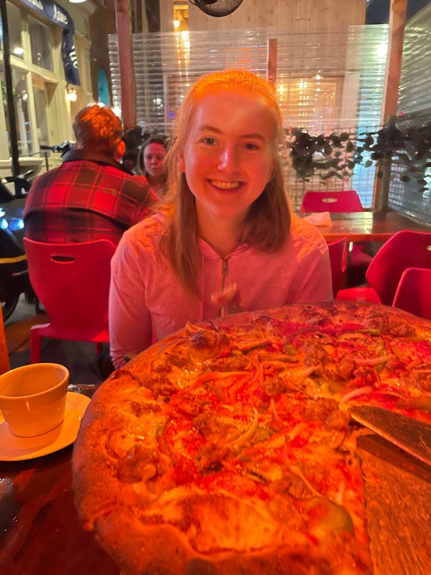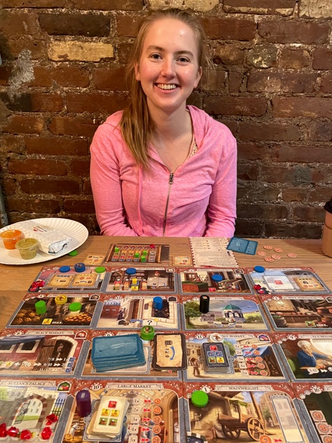 Kat orders some food. I set up and teach her Istanbul. This game is more experience than a teach. So I play it with her and get most of the rules right. We fixed one mistake, and play continues. Kat watches as I make very efficient moves and learns how to play. I won by a significant margin. She was ready for the next game. She won by one gem (I was so close).