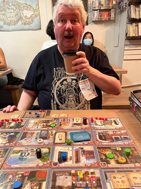 We played two games, and Kat got a taco. We then thanked our hosts. It was a nice place but a bit packed for a pandemic (vax status must be proved to be inside). While I taught Kay Istanbul and played two games, and Kat ate a taco, another group was still trying to learn Fall of Rome, Pandemic. This suggests that maybe that version of the Pandemic series is not needed in my collection.