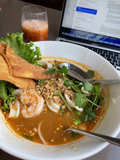 I missed helping Susie with breakfast, and lunch was late. I had only toast for breakfast, so at half past noon, I stepped out for lunch at the Red Onion and ordered mildly spiced Tom Yum soup.