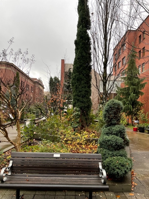 I have Tom Yum soup at the Red Onion Thai place for lunch. I like their food, and I have learned the path through the garden past ER to get there, avoiding walking around the hospital. The garden looked so happy in the rain. I took a photo. Yes, after you live her twenty-five years, you like wet and gray.