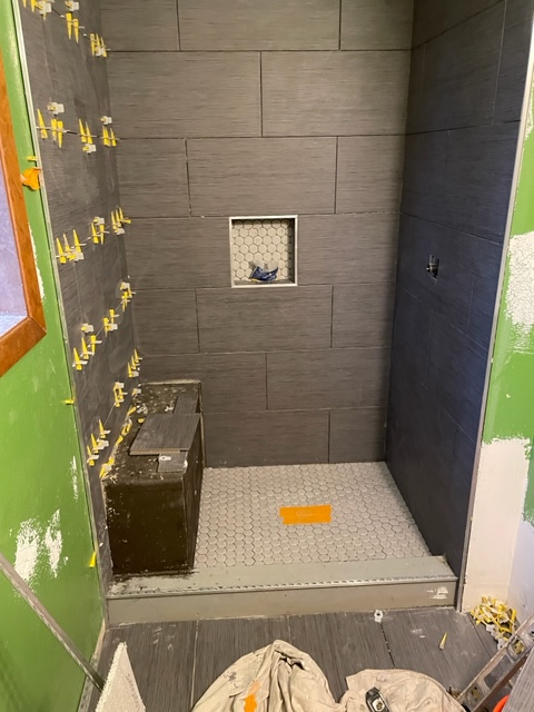 Jeff had another wall done in the shower and ran late as I did not see him until I returned home. He would not quite finish the last wall in the shower today as it has a seat and requires him to cut tile, a time-consuming process, to make it work.