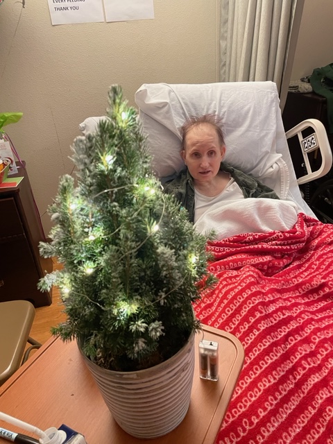 I get back and remember to take in the tree from the Smith Family (+Jason) for Susie. It is a little live tree with lights. Susie was excited and happy to have a lighted tree.