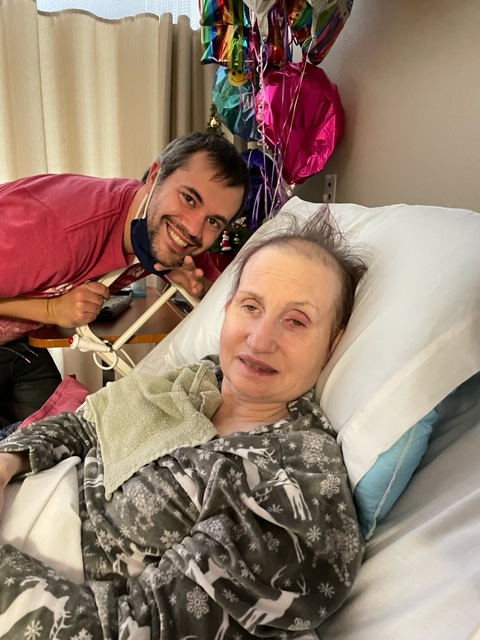 Evan and I return to Susie, and we wake her again. We chat a bit and then do some music videos with her. Evan learns YMCA arm movements, and we do those to the song. Susie just moves her hands a bit but enjoys the action.