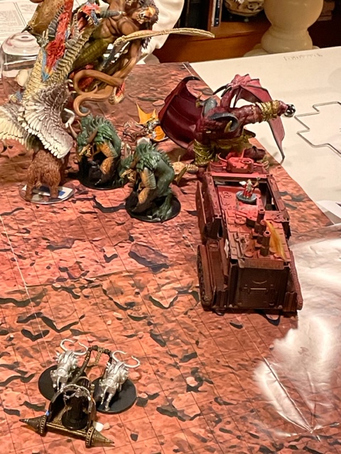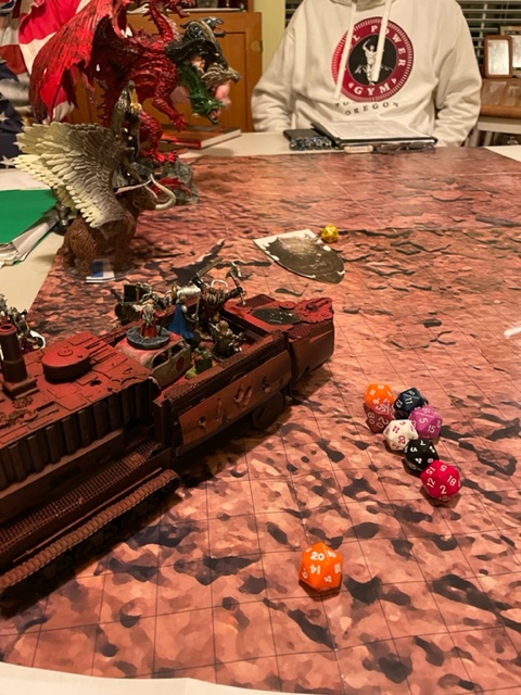 The last use of the model. You can see the player’s figures on one last ride. The front is missing the main weapon as the “ship” took previous damage, but we were able to make it work, so it is back in the final attack on Orcus.