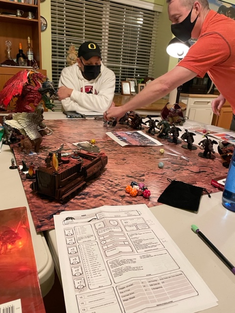 I picked up a pizza and salad after ordering it from Papa Murphy’s online. Corwin and I managed to scarf it down before heading to the Dungeons and Dragons game at Cory’s house. Cory is handicapped, losing his legs to various infections, so we play, now again with masks, at Cory’s home.