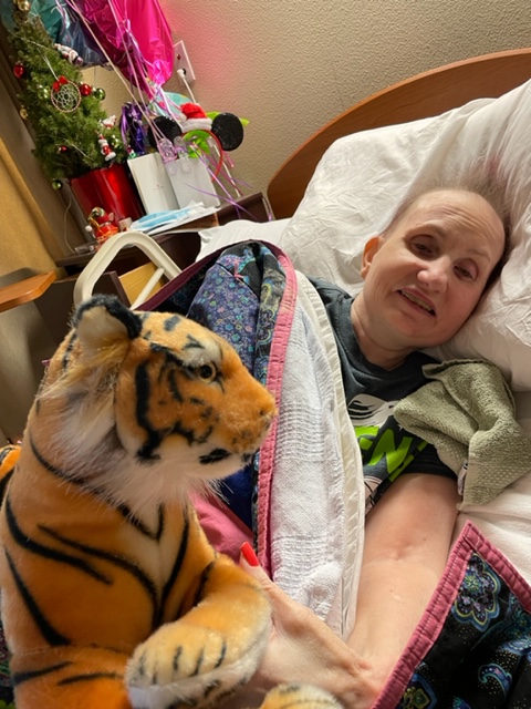 Susie was happy to have a tiger with her and smiled. Next, we called Leta on FaceTime and Susie, and she spent some time chatting. Susie is still hard to understand but tried to get more words out. Following this, we called Susie’s Aunt Joyce in North Carolina and thanked her for the tiger.