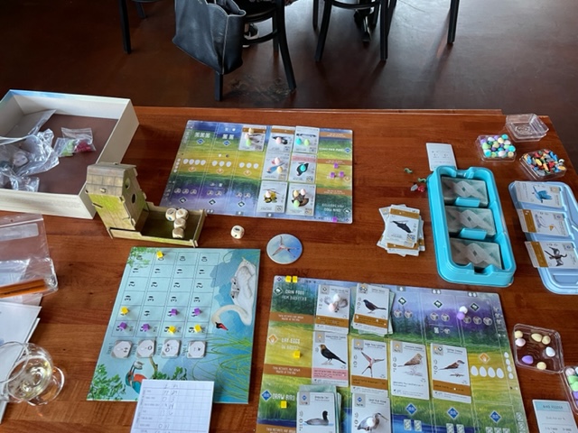 As I said before, I met Evan for Mexican food after leaving Susie at the Forest Grove Rehab and Care Center at 3900 Pacific Highway, Room 44A. I did stop at the house to pick up Wingspan. My copy as wooden food items and extra purple eggs. Just a little bling.