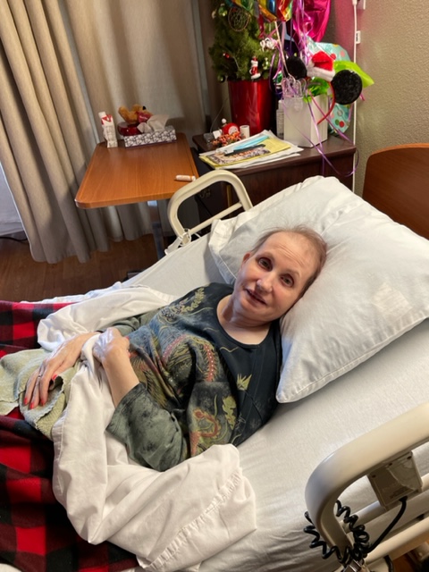 Returning to the story, I passed the entrance requirements and put on gloves. I am full of chemo and should not share it with anyone. Susie was having a good day; she was up previously and watched TV and chatted with the nurses. The mouth issues are gone, and Susie’s voice and speaking are better. A wonderful surprise.