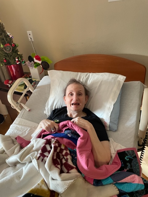 Today Susie is still in bed. This is because I am between lunch and dinner, and it is my experience that Susie usually gets a nap about this time. Susie looks tired but excited to have me there. We do the FaceTime process with her mother, Leta, and her sister, Barb, also answers. Susie starts to get tired, and soon I am headed back.