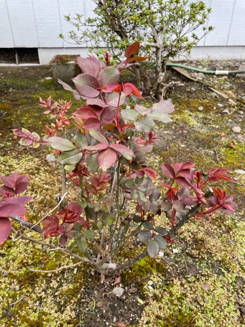Mister Lincoln, the last new rose, was just a few tiny sticks when we got it, and we got two blooms the previous year. This winter, it has thrived and is now a small bush ready to explode into a huge plant. When I planted the three tiny sticks last year, Corwin provided me with the hole; I was not sure it would live. It is a modern tea rose, resistant to black spot disease and growing on its own roots. It is currently out-of-stock from my local rose providers; see here.