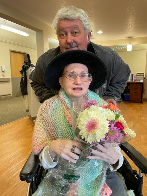 I have brought Susie flowers, and the nurses and aides are helpful and get us chairs; lunch is finished, all the other residents at the tables by the nurses’ station head out. So we have Susie to ourselves.