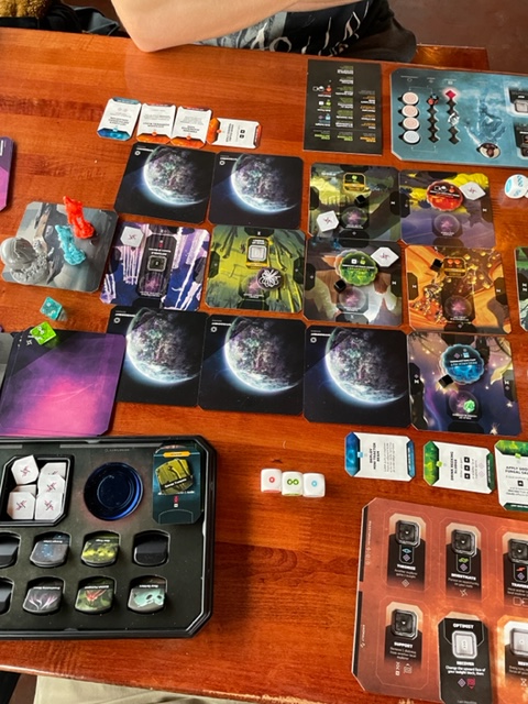Evan and I headed to The 649, which was busy even having just opened. We got our table and played a board game, Unsettled. This is a cooperative game from Vancouver, just across the river in Washington state, and involves trying to explore and survive a strange new world, SciFi gaming. I know the game designers and they consider me a part of their greater team, I am flattered. I did update their Discord with my pic below and some comments.