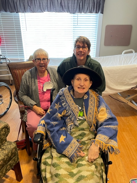 Barb and Leta (Susie’s sister and mother) are in room 44A with Susie. Susie is in her wheelchair. Susie’s roommate has been out for a few days now. So the room is ours.