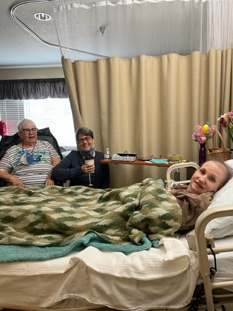 We headed from Hillsboro to Forst Grove Rehab and Care Center at 3900 Pacific Highway, Room 44A. As it was still early, Susie was back in bed, having had breakfast at the tables near the nurses’ station. She was pleased and nearly overwhelmed to see all of us coming to see her simultaneously.