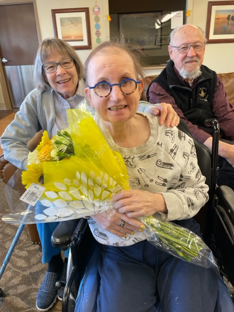 Susie is just finishing lunch as we come in. The tables are packed with new residents, most aphasic. We move Susie after she finished her lunch to the lobby and hang out with her. After a few words, we call Susie’s mother, Leta, on FaceTime, and she and Susie chat for a bit.