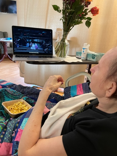 Susie and Terry, Susie’s roommate, were in bed, and I had to awaken Susie. I replaced the flowers with the new flowers and started the Opera party. I paid for Turandot, the 2019 telecast version, from the Metropolitan Opera (New York City) website. We could not see the version that Leta, Susie’s mother, Barb (sister), and Emma (neese) were watching in the theater. The Met was presenting the opera worldwide simultaneously in movie houses. We could not do the movie house, but we could at least watch it and hear the same Opera from 2019’s telecast. I also had popcorn!
