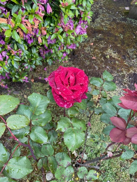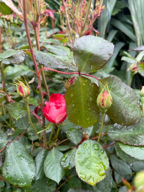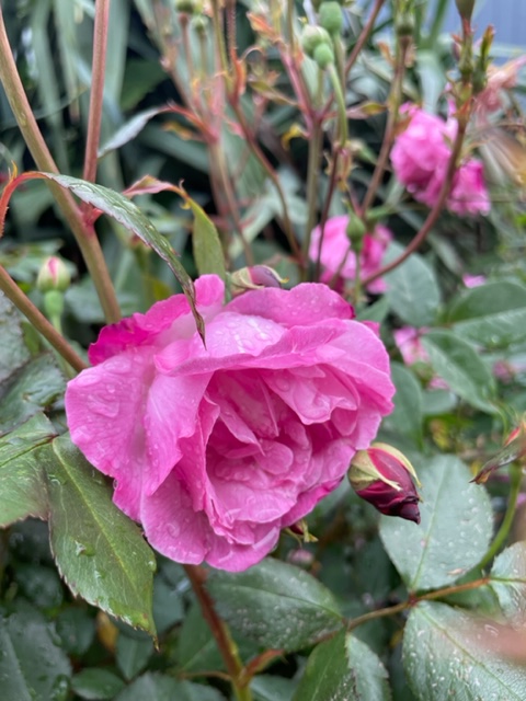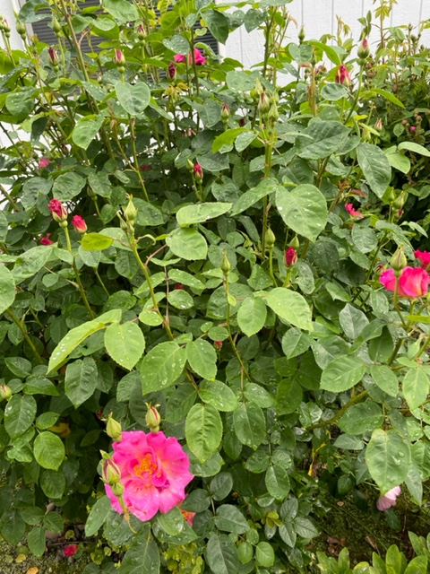 Lastly, the China Rose, also called Old Blush, is blooming full-out and grown five feet tall after being cut back. This is the best rose I have gotten from it in years–it must love the rain: