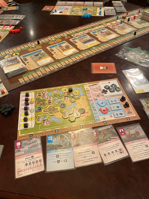 Continuing with the narrative backward, we had met at Richard’s house in Portland across the river and not far from Lloyd Center at our usual time of 6:30. Kathleen wanted to play Arc Nova again. I started out well and fought Kathleen for the lead when I stalled. I could not get the normal animals for my zoo, this is a Euro resource management and worker placement game, and I spent quite a few turns searching for better animals, but none showed for me. I was obviously doing something wrong. It appears that I had not upgraded my animal abilities soon enough, and also, Richard was grabbing a lot of the easy animals.