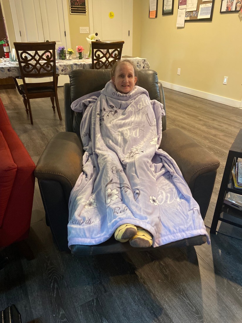 Aside: Michelle Nixon sent this picture later of Susie using the new blanket and socks.