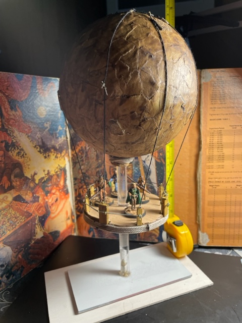 I had built the balloon part months ago from a 6″ styrofoam ball. The rigging and basket and the supports (now a post of transparent plastic rod 1″ thick) had me flummoxed for months. I bought some parts on eBay from some defunct wooden ship models, which got me headed in the right direction. I built much of it like a wooden ship model but using a simple rigging plan.