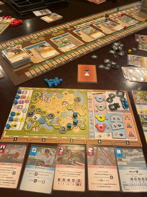 After that game, Shauna left us to play Arc Nova. This is the same board game I have played for the past three weekends and lost. And tonight, scoring -14, I had my best night. Shawn had a positive score, a good showing for his first game. I again got stuck about 3/4 through the game, but I made fewer mistakes and misplayed not building more buildings in my Zoo. I do like the game, but each turn is complex–and those types of games are hard for me to win. Richard, Shawn, and Kathleen are excellent at these Euro engine-building games.