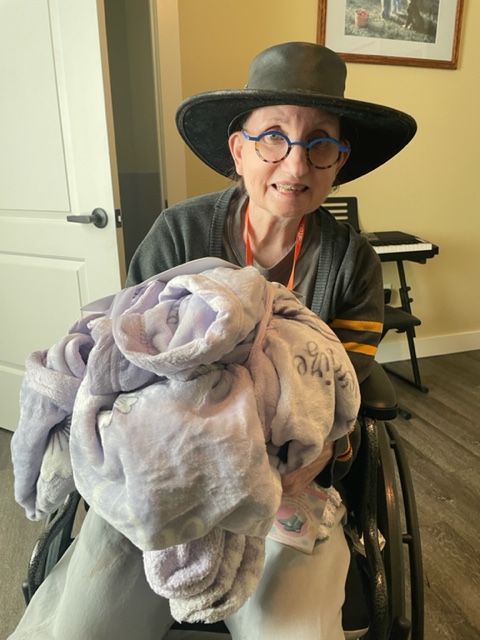 Susie received a package from my Aunt Kathy. Some socks and a blanket, all purple. Susie loved them!