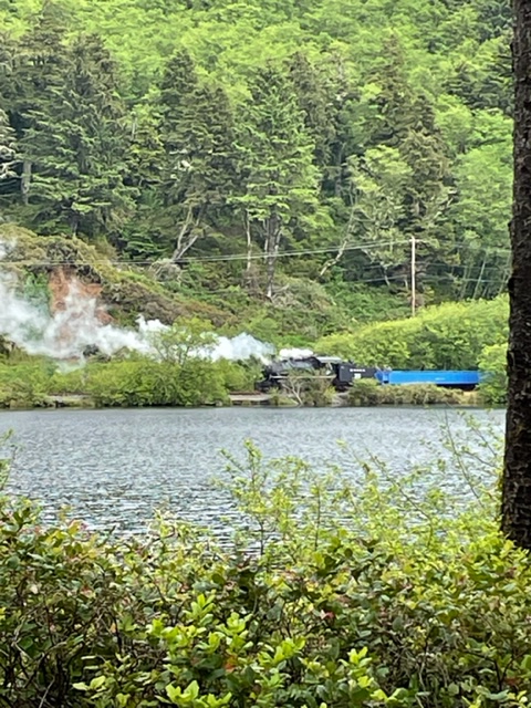 Aside: The steam train for tourists and train lovers running backward near the camp. The smoke hides the brown dirt showing on the partially slide that did not block the road!