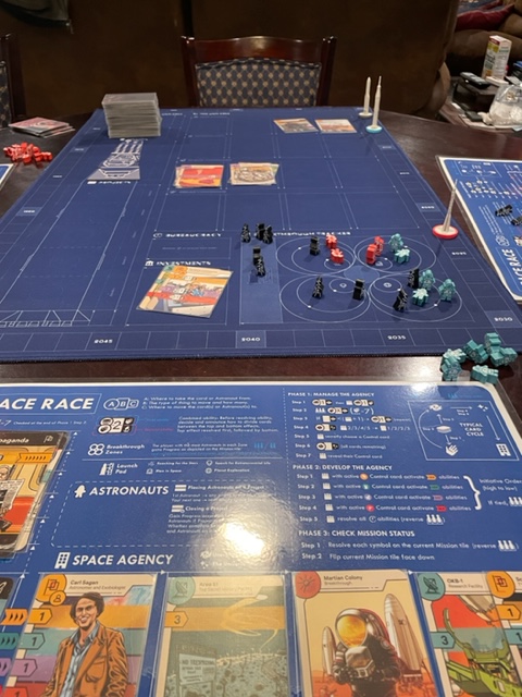 Space Race was a Kickstarter game, and we have all the add-ons (both Richard and I backed the Kickstarter, we both liked the theme). I also have the 3D print files for the rocket models in the game–the game designers have been very supportive.
