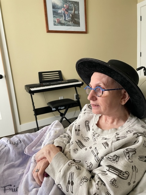 Susie was up in the wheelchair; I had just missed Evan, who stopped by Hummingbird House for his lunch hour to see Susie. I set up the screen and my Apple laptop, an M1 13″, and played the movie La La Land. Susie was resting in a recliner for the film and slept a few times, holding my hand. She woke up and then fell asleep a few times, waking for the good parts. One of my favorite songs is the duet for “City of Stars”: here.