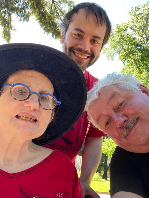 Evan pushed, and we went to the end of the paved trail, then onto a street and back. About halfway, the wind, blowing hot air, unloaded all the stuff in the pine trees, and we were pelted for a bit with tiny tree bits. Susie’s hat blew off; the wind was a sudden surprise!