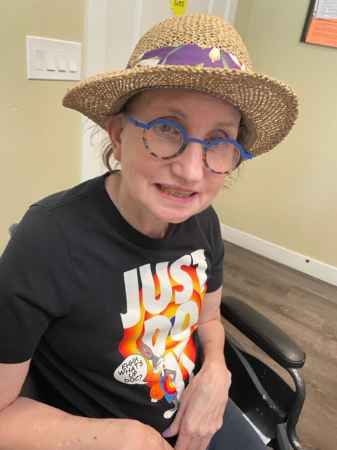 Susie was just finishing breakfast. I handed Jennifer the cut roses. Jennifer is the nurse for today, and she lives there with her family on the second floor. I also brought Susie her summer wear, a straw Panama Jack hat. Jennifer arranged the flowers in a vase.