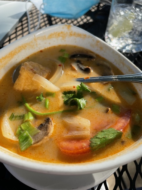 The waiter, Levi, recommended the Levi special (a sort of sweet and sour chicken Thai styled)–Apparently his creation. I had that and Tom Kha soup too. Evan ordered a shrimp with salad and something else I missed the name for.